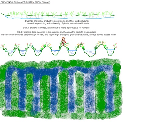 Chinampa system: created by deepening swamp into deep sections divided by raised mounds; enables both fish culture and plant culture: traditional aquaponics