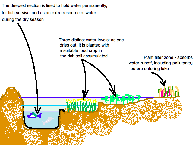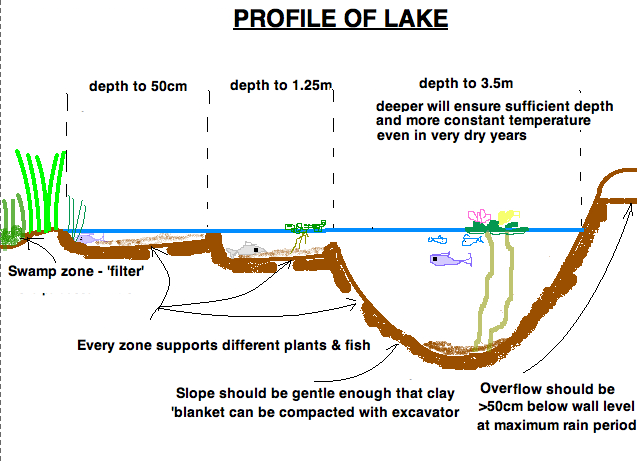 - different levels are important to provide range of habitats; large fish naturally move to deeper water and deep water ensures region of lower temps during summer months. Shallow water can carry weed growth which offers protection to small fish, and is source of large quantities of food, providing habitat for water fowl, and producing food crops such as water chestnuts, taro, and arrowhead ie; polyculture.